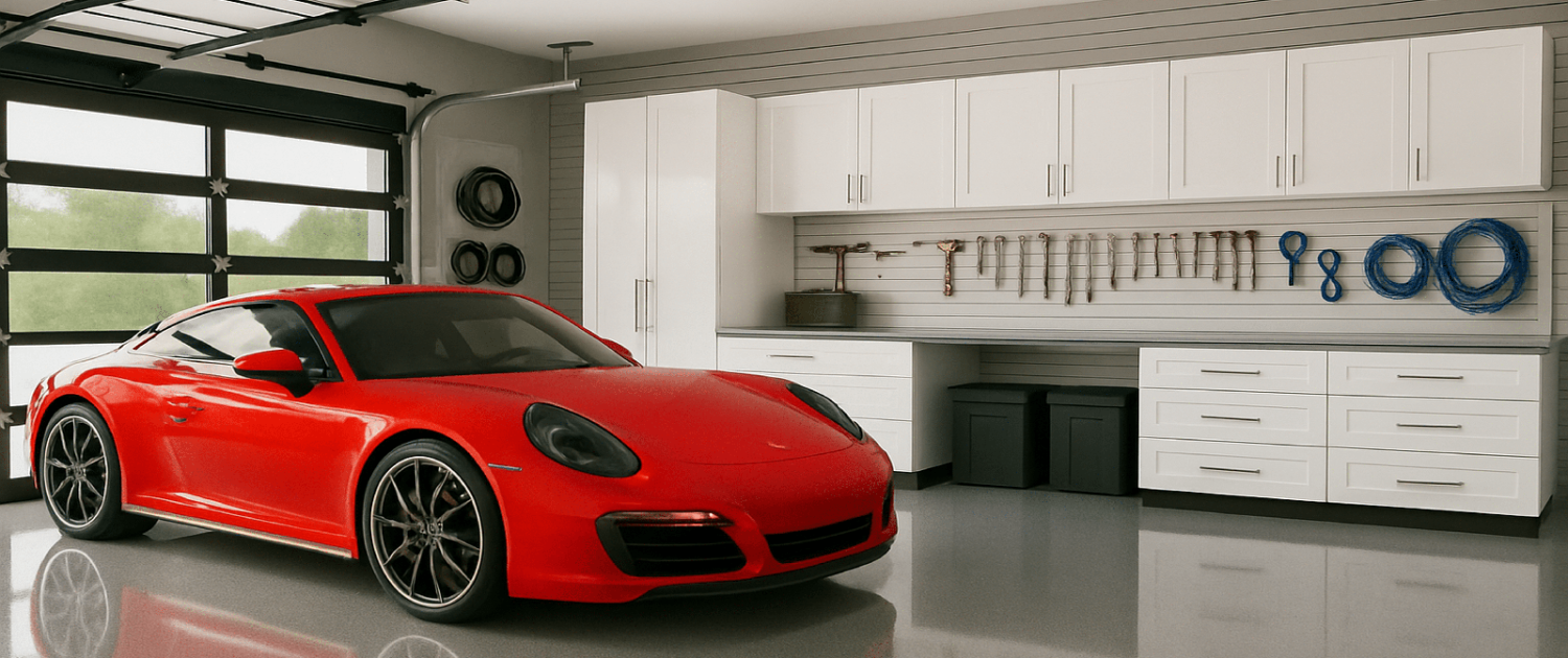 Our epoxy polyaspartic floors are also a great compliment to other garage organization and aesthetic upgrades. We can create a design that incorporates garage ceiling storage racks, garage shelving, garage cabinets, and wall organizers like slatwall panels.
